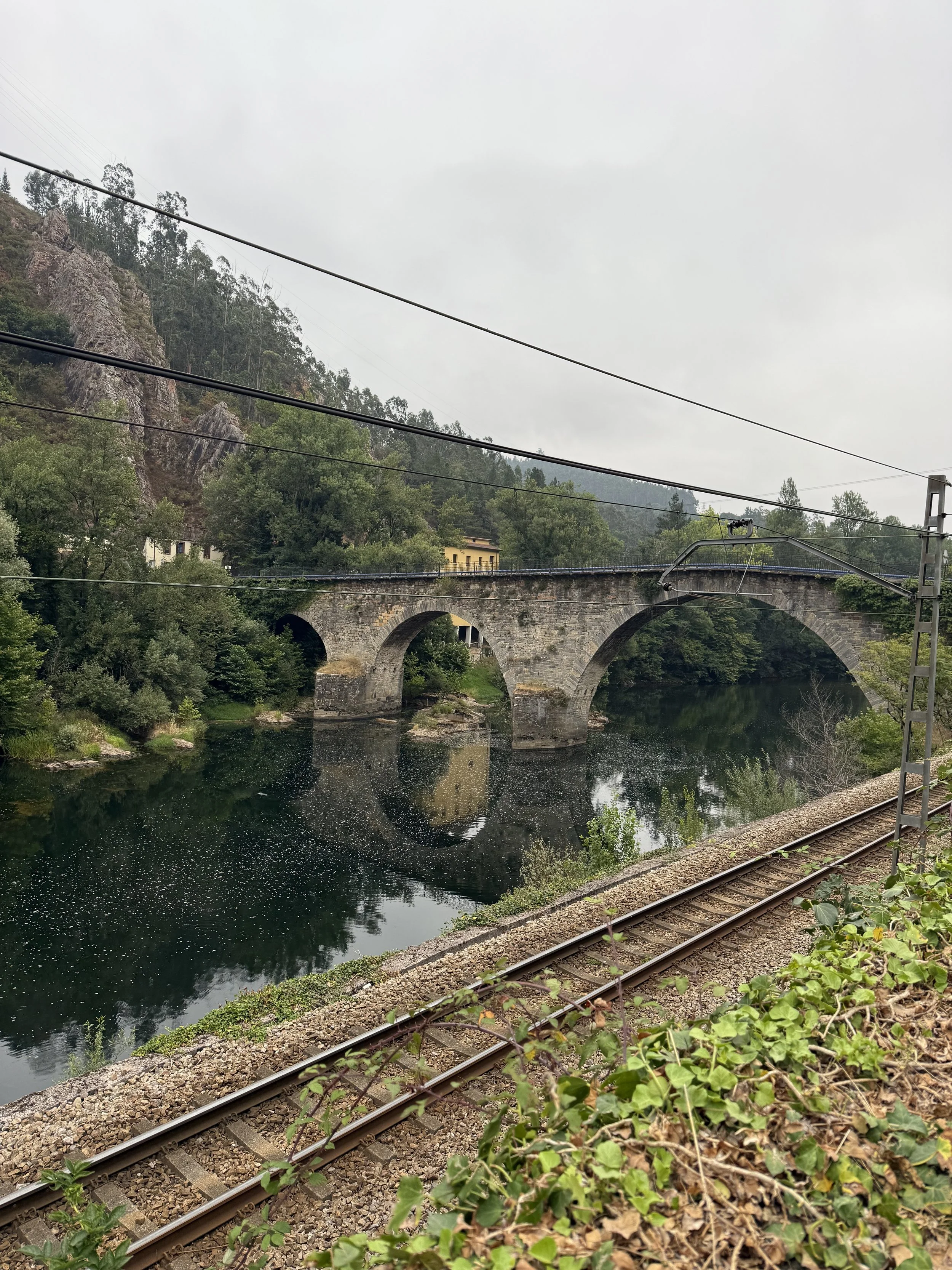 We walked across a beautiful arched bridge over a river surrounded by imposing rock faces. The river was teeming with fish all blowing bubbles on the water surface and a single railway track ran beside it.
